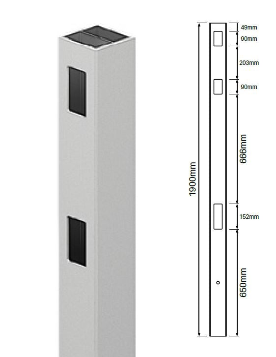 • Includes internal 1.5mm thick aluminium insert entire length of post (ie 1900mm long). Provides post rigidity and also, sturdy substrate for fixing of hinges or latch