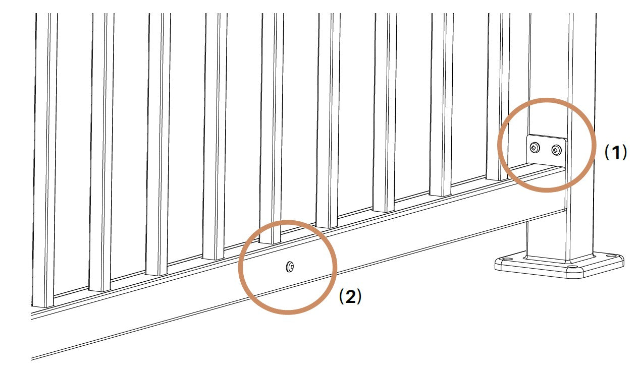 (2) fixing sideway through the bottom rail into the baluster at 2 places per span to act as a 'locking' screw to mechanically fix bottom rail to balusters