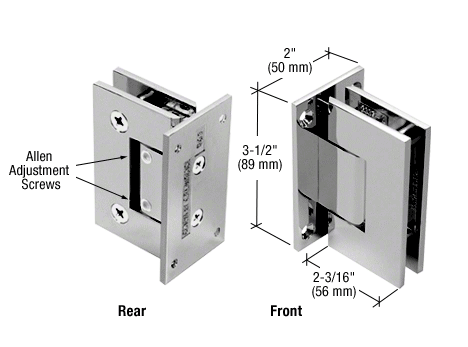 The Glass House Adjustable Series has taken our popular Geneva Hinge to a new level. Adjustment to accommodate the desired angle (up to 90 Degrees ) is done after the door is installed. Once the door is hung, simply loosen the Allen set screws and turn the door to the desired closed position. By merely tightening the Allen screws your door will self-center to the desired closing position. The door can swing 90 Degrees inward and 90 Degrees outward (adjusting angle from factory set position will reduce 90 Degrees swing in that direction). For doors pulling outwards only (using a clear door jamb), you can adjust the hinge to close 5 Degrees inside the shower area, thus having the door close snugly against the jamb.
