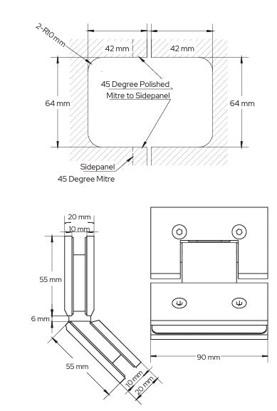 The Adjustable Perth Series of professional hinges are pre-set to accommodate 10mm thick glass. Adjustable to accommodate the desired angle is done after the door is installed. The gaskets are glued into the hinge, promoting rapid installation. Composed of solid brass, the spring will self-centre within 25 Degrees of the closed position and will open both inwards and outwards. The hardware is available in three standard finishes - Chrome, Brushed Nickel and Matt Black. The door can swing 90 Degrees inward and 90 Degrees outward (adjusting angle from factory set position will reduce the 90 Degrees swing in that direction).