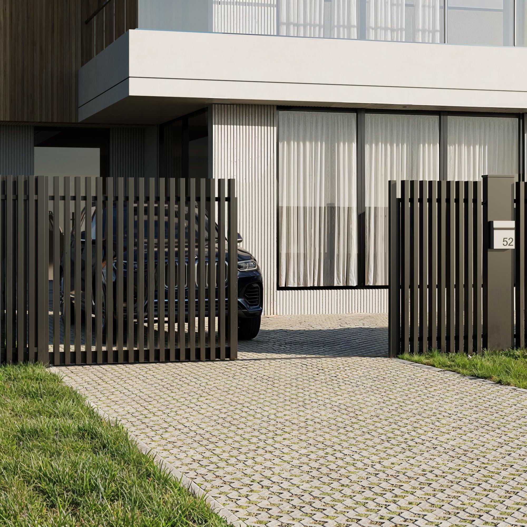 Our flat-packed aluminium batten sliding gate system is the perfect choice for modern homes and commercial spaces. With your choice of batten size, this gate combines style, strength, and simplicity.