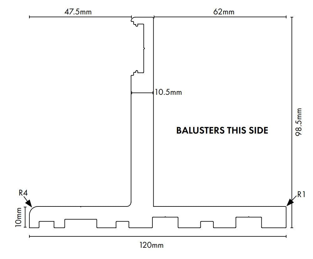 • Base fully machined to enable 50x10mm balusters to be screwed fixed at 100mm centres (providing 90mm gaps). 40 x balusters per length.