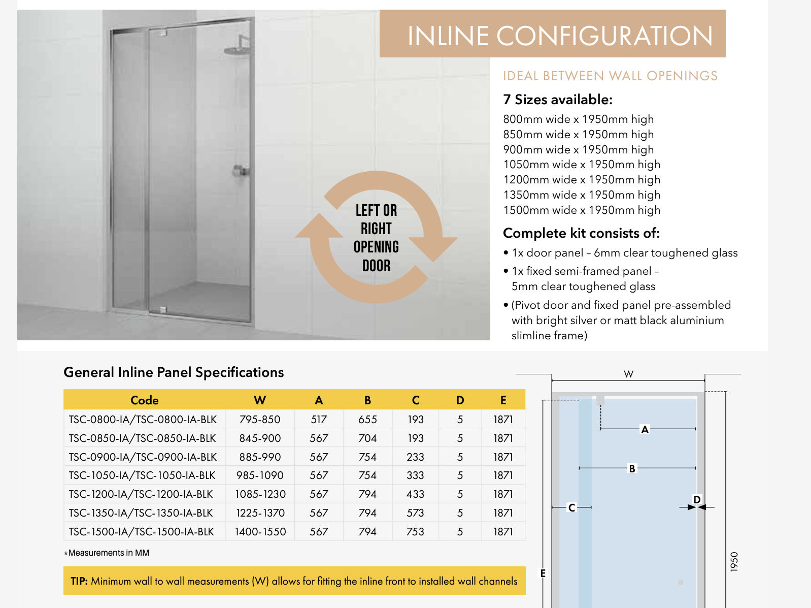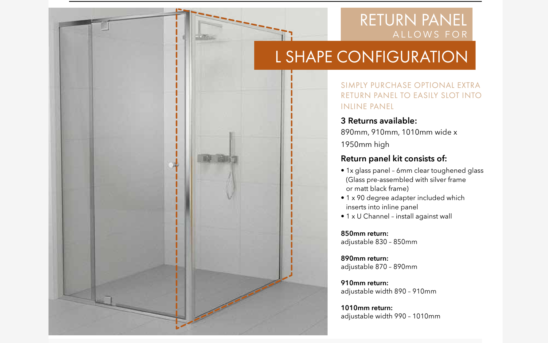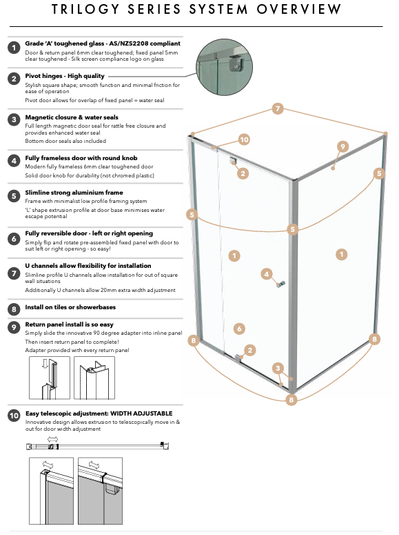 • Grade 'A' toughened glass - AS/NZS2208 compliant Door & return panel 6mm clear toughened; fixed panel 5mm clear toughened - Silk screen compliance logo on glass