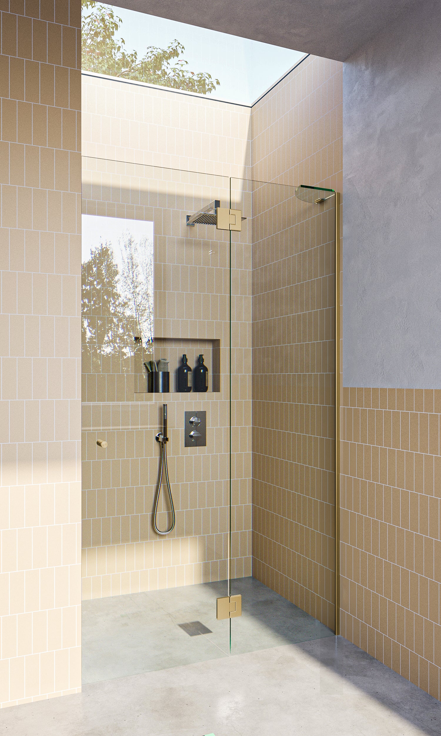 Brushed Brass / Satin Gold Frameless Wall to Wall Shower Screen with Dry Glaze U Channels, Door and Hinge Panel