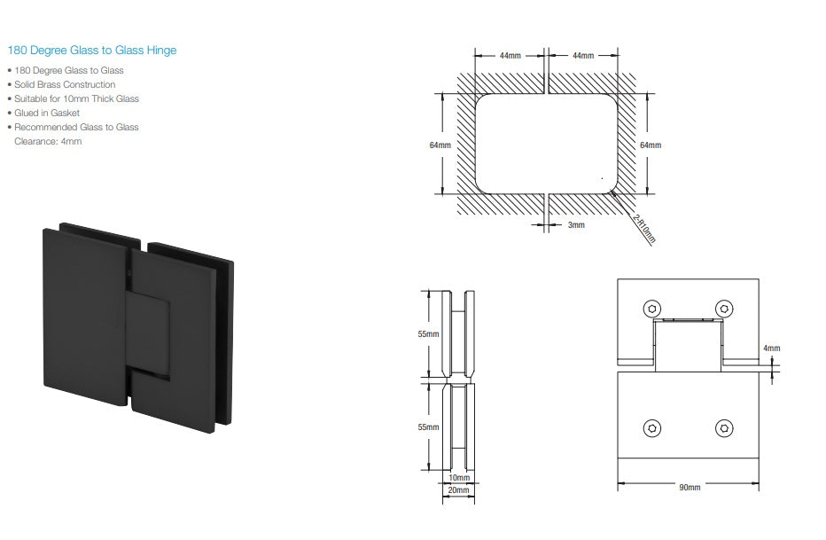 The Perth Series of professional hinges from Glass House are pre-set to accommodate 10 mm thick glass. The gaskets are glued into the hinge, promoting rapid installation. Composed of solid brass, the spring will self centre within 25 Degrees of the closed position and will open both inwards and outwards.