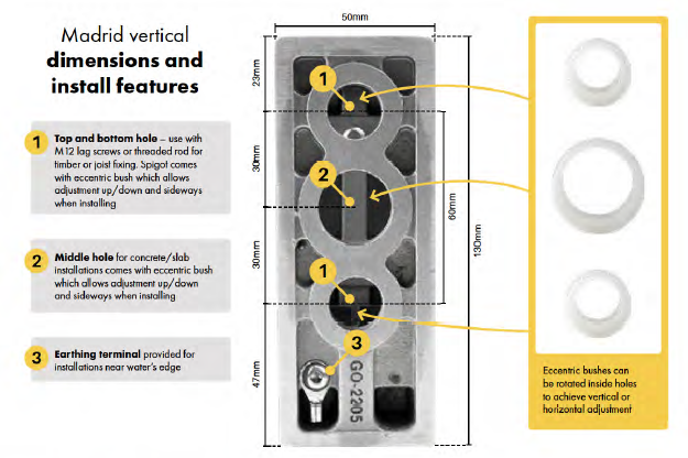 • Face mount spigot can be fixed to concrete, timber, beams or bearers