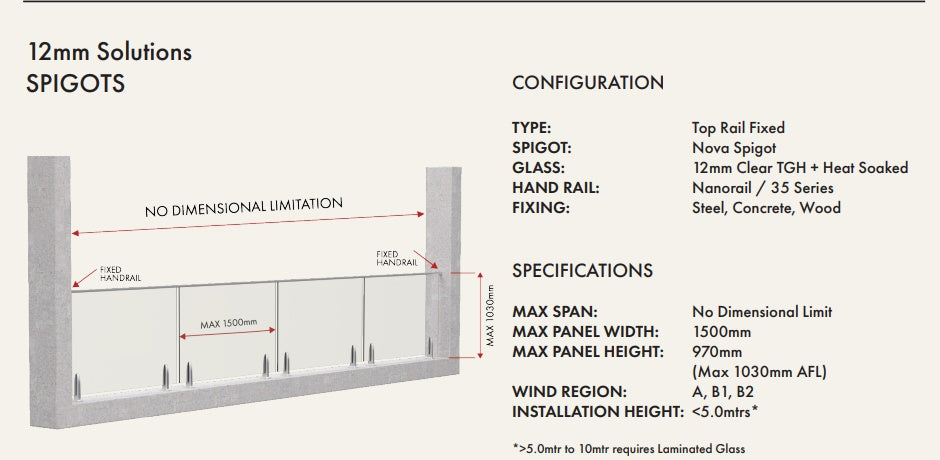 • Newly designed to help satisfy barrier codes using 12mm tough heat soaked glass at 970mm high.Β  Β See pics for max glass width if under 5 metres from floor.Β Β