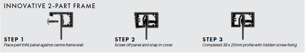 • 2 part frame design enables hidden screw fixing of perf sheet to