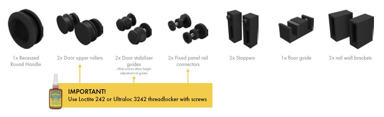 2 x Stoppers; 1 x Floor Guide; 2 x Rail Wall Brackets;