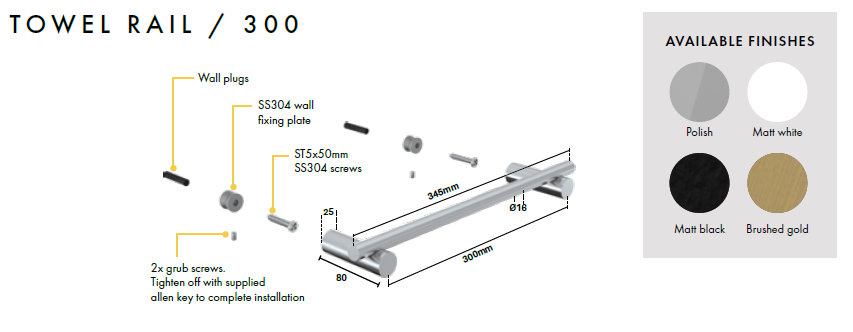 • Includes fixing screws, wall plug & allen key
